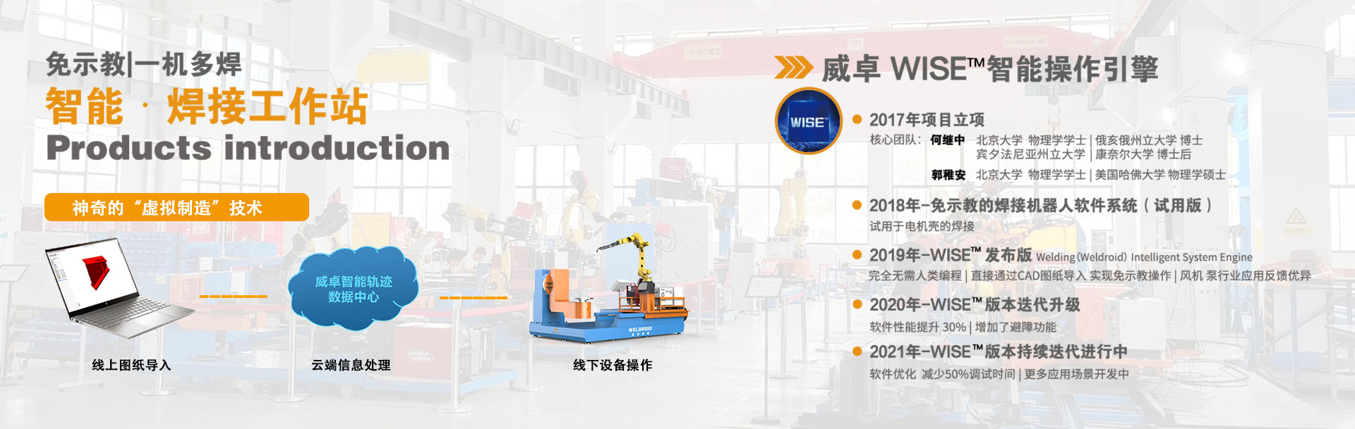 無錫威卓智能機(jī)器人有限公司成立于2017年,是無錫市政府引進(jìn)的科技領(lǐng)軍型高新技術(shù)企業(yè),公司研發(fā)團(tuán)隊(duì)80余人,我們堅(jiān)持自主創(chuàng)新,利用自主開發(fā)的虛擬制造技術(shù)對(duì)傳統(tǒng)焊接行業(yè)進(jìn)行升級(jí)改造。 公司主推的工業(yè)風(fēng)機(jī)系列-智能焊接工作站產(chǎn)品,具有免示教、實(shí)時(shí)跟蹤、簡易工裝、傻瓜式操作等優(yōu)點(diǎn),真正幫助企業(yè)解決了招焊工難,用工成本高,焊接質(zhì)量不穩(wěn)定等問題。